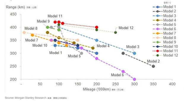 За наслідками тестувань, після пробігу в 2 мільйони кілометрів акумулятори CATL утримували запас ходу на рівні приблизно 400 км. Для співставлення, батареї інших постачальників в аналогічних умовах показували відчутно гірші результати – орієнтовно 350 км або навіть менше. Мова йде не про лабораторні експерименти, а про масштабне дослідження, що охоплює 12 електричних автомобілів, 100 екземплярів акумуляторів і фактичне використання в чотирьох великих містах Китаю. Аналітична діаграма Morgan Stanley Research чітко демонструє, що моделі з батареями CATL зношуються помітно повільніше, ніж авто з акумуляторами інших виробників.