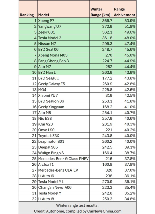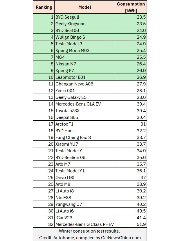Окремий наголос було зроблено саме на зимовому запасі ходу, оскільки це одна з головних скарг до електромобілів у країнах з холодним кліматом. Результати підтвердили відомі з теорії, але часто недооцінені на практиці фізичні обмеження. Літій-іонні акумулятори втрачають ефективність на холоді через зростання внутрішнього опору, додаткові витрати енергії на підігрів самого акумулятора та суттєве навантаження від системи обігріву салону. В підсумку більшість автівок у тесті втратили понад половину заявленого діапазону їзди. При цьому варто враховувати, що зіставлення велося з китайським циклом CLTC, котрий сам по собі вважається доволі оптимістичним, тому падіння реальних показників виглядало ще більш показовим.