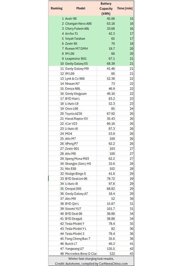 Окремо перевіряли і швидкість швидкісної підзарядки в екстремальному холоді, з інтервалом від 30% до 80%. Тут несподіваним лідером став Avatr 06, якому знадобилося лише 15 хвилин, тоді як багато відомих моделей витрачали вдвічі більше часу. Для порівняння, Tesla Model Y у цьому сценарії показала значно скромніший результат, що ще раз підкреслює, наскільки складно забезпечити стабільну зарядну потужність у мороз навіть для технічно зрілих платформ.