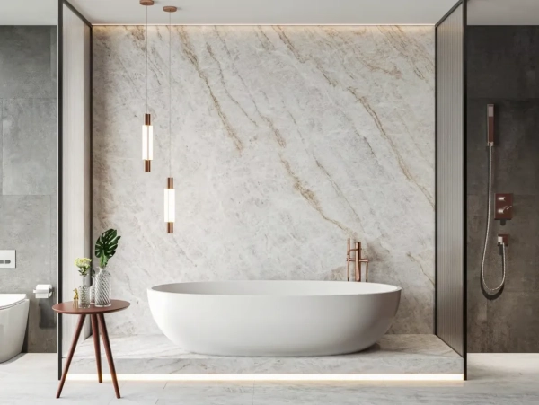Поєднання кварциту Taj Mahal і білого дуба – застаріле рішення для ванної / Фото Better Marble