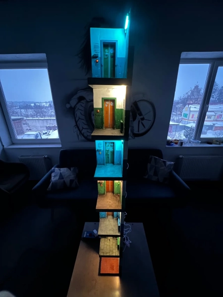 Все почалося з випадково знайдених кусків пінопласту. Спочатку я мав намір створити якусь абстрактну архітектурну форму, але поступово образ під’їзду проявився сам собою. Я змонтував двері ліфта, встановив малесеньку кнопку і додав те саме приглушене світло. Результат мене вразив,