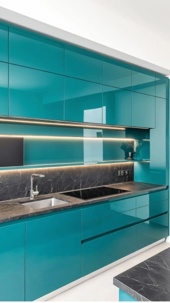 Бірюзові шафи мають дуже особливий характер і найкраще виглядають у прибережних будинках або курортних інтер’єрах. У типових міських кухнях цей колір швидко втрачає актуальність і може виглядати занадто “тематично”.