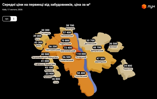 Ринок первинної нерухомості в Києві у лютому 2026 року показує поступове збільшення цін. Середня вартість квадратного метра в новобудовах столиці перетнула позначку в тисячу доларів, а розрив між Києвом та його околицями залишається суттєвим.