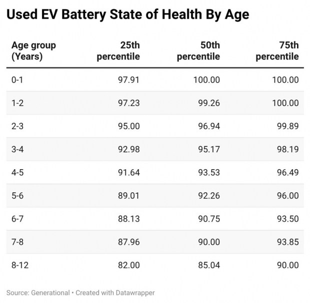 Згідно з відомостями звіту, медіанний показник стану акумулятора для електромобілів віком 2-3 роки становив 96,94%. У групі 3-4 роки він зменшувався до 95,17%, а серед авто віком 8-12 років – до 85,04%. Отже, з часом деградація збільшується, проте навіть у старіших машин показники переважно залишаються вище типових гарантійних меж.