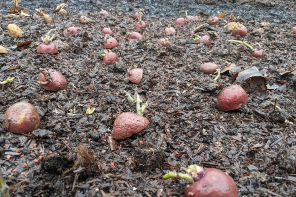 - Бульби не заглиблюють у ґрунт, а вкривають щільним шаром покривного матеріалу з сіна чи опалого листя, що допомагає утримувати вологу та обмежує ріст бур’янів.