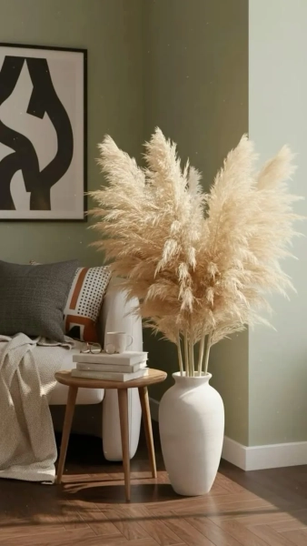 Альтернатива: живі квіти, засушені рослини або навіть звичайні гілки в елегантній вазі. Такі деталі створюють атмосферу доглянутого простору та природної гармонії.
