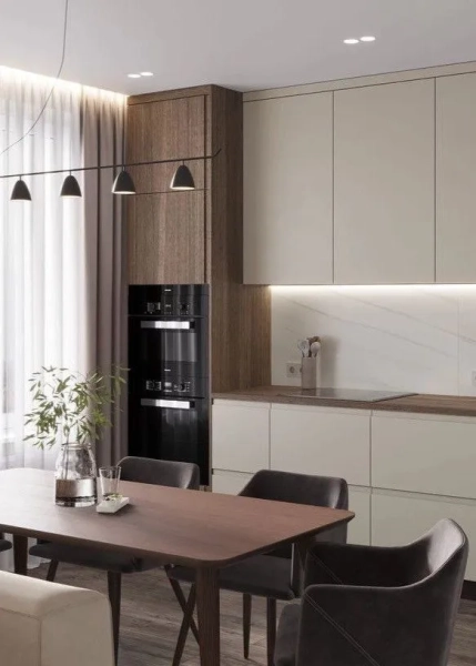 • Однією із помітних тенденцій стала відмова від кухонних шаф, які не досягають стелі. Раніше між верхніми шафами і стелею часто залишали вільне місце, яке використовували для декору або просто залишали пустим.