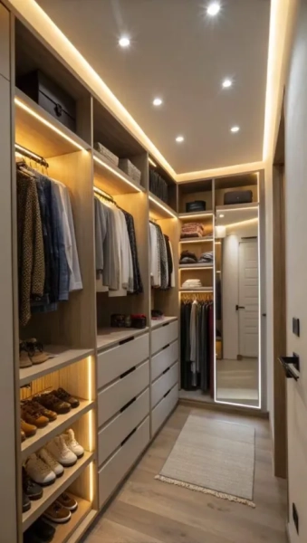 Більшість гардеробних у квартирах позбавлені вікон, тому дуже важливе якісне освітлення. Якщо світла бракує або воно розташоване невдало, важко розрізнити колір одягу, а сам простір виглядає тісним і незатишним.
