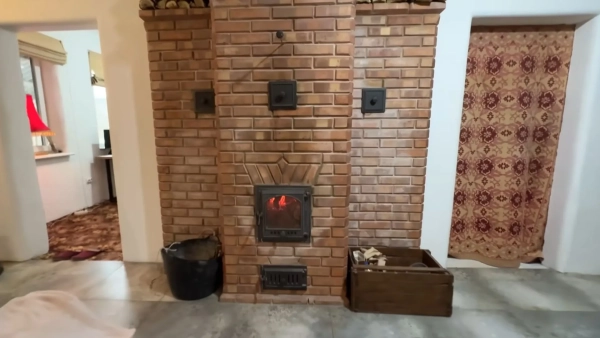 Будинок обігріває велика піч, яка коштувала приблизно 2 тисячі доларів. Вона обігріває всі кімнати. Також встановили теплу підлогу у вітальні та санвузлі. Централізованого газопостачання немає – використовують газовий балон.