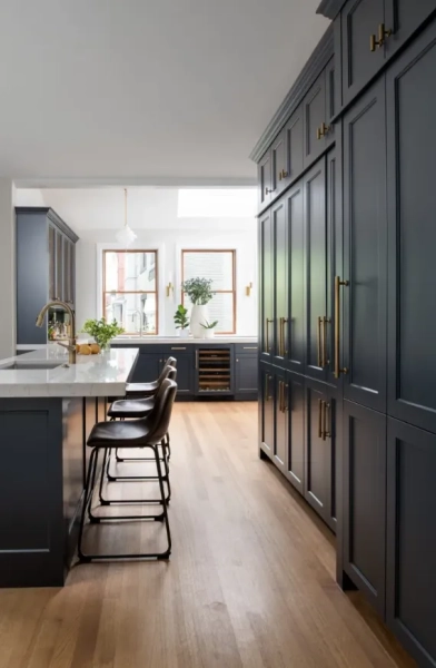 Це сучасна альтернатива класичному темно-синьому або чорному. Вони виглядають стильно і стримано додають глибини кухні. Також ці тони добре поєднуються зі світлими стільницями та металевими акцентами.