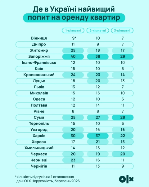 - Найбільший інтерес до знімання житла зафіксовано в Запоріжжі та Харкові, де на кожну пропозицію припадає 40 та 30 реакцій, відповідно.