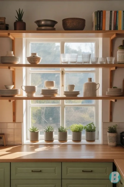 Полиці перед вікном – це більш декоративне та практичне рішення: полиці встановлюються безпосередньо перед вікном або частково його закривають. На них розміщують кімнатні рослини, скляний або декоративний посуд, книги з рецептами, невеликі кухонні приладдя.